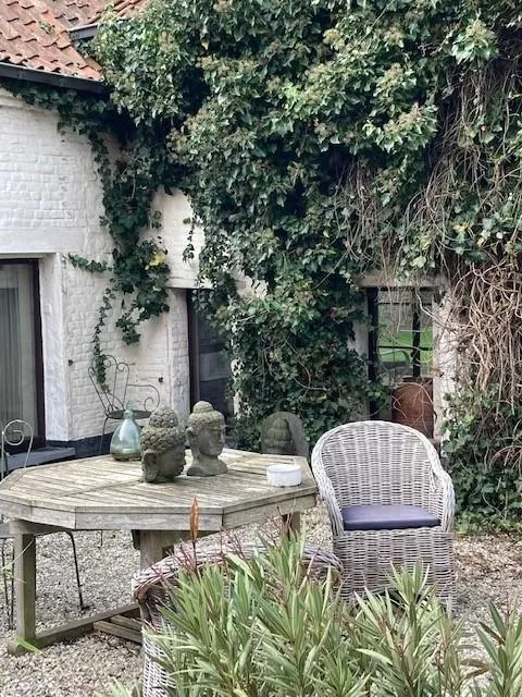 Ruim en charmant gastenverblijf, in totaal zowat 100 m² privatief, met eigen toegang. Slaapgedeelte, met aansluitende (eenvoudig ingerichte) badkamer onder houten dakgebinte op eerste verdieping. Gelijkvloers, exclusief voor gasten, omvat eet- en relaxgedeelte, met open haard, diverse zetels en lange (werk)tafel, wifi beschikbaar. Directe toegang tot binnenkoer en wildere (afgesloten) tuin van zowat 1.500 m², wel gedeeltelijk gemeenschappelijk met eventuele gasten afgescheiden vakantiewoning en soms eigenaars. Voldoende comfortabel tuinmeubilair, o.a. houtgestookte (pizza)kachel. Geen volwaardige keuken (nog niet, wel in planning), wel frigo met vriesvak, micro, koffiezet, ...