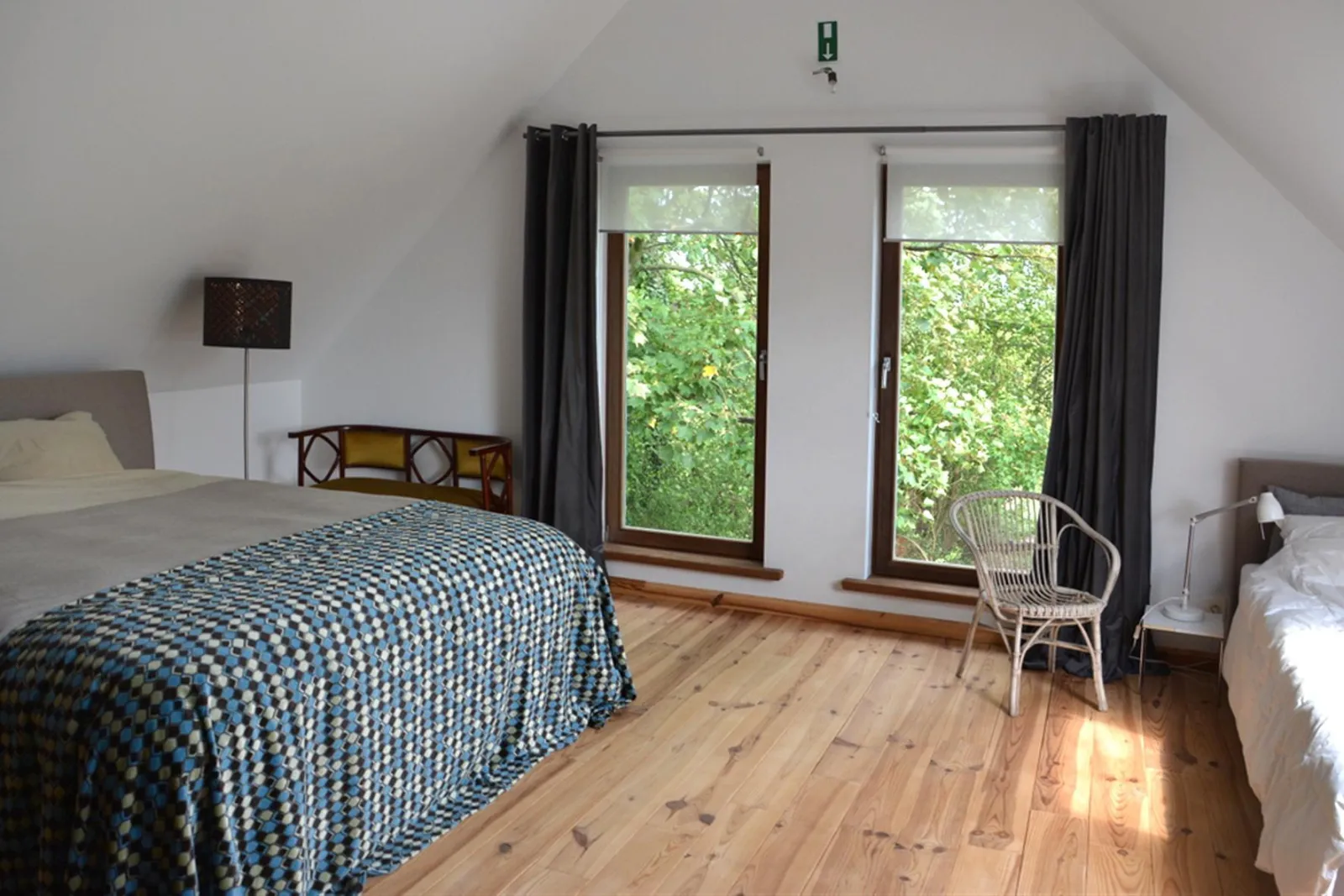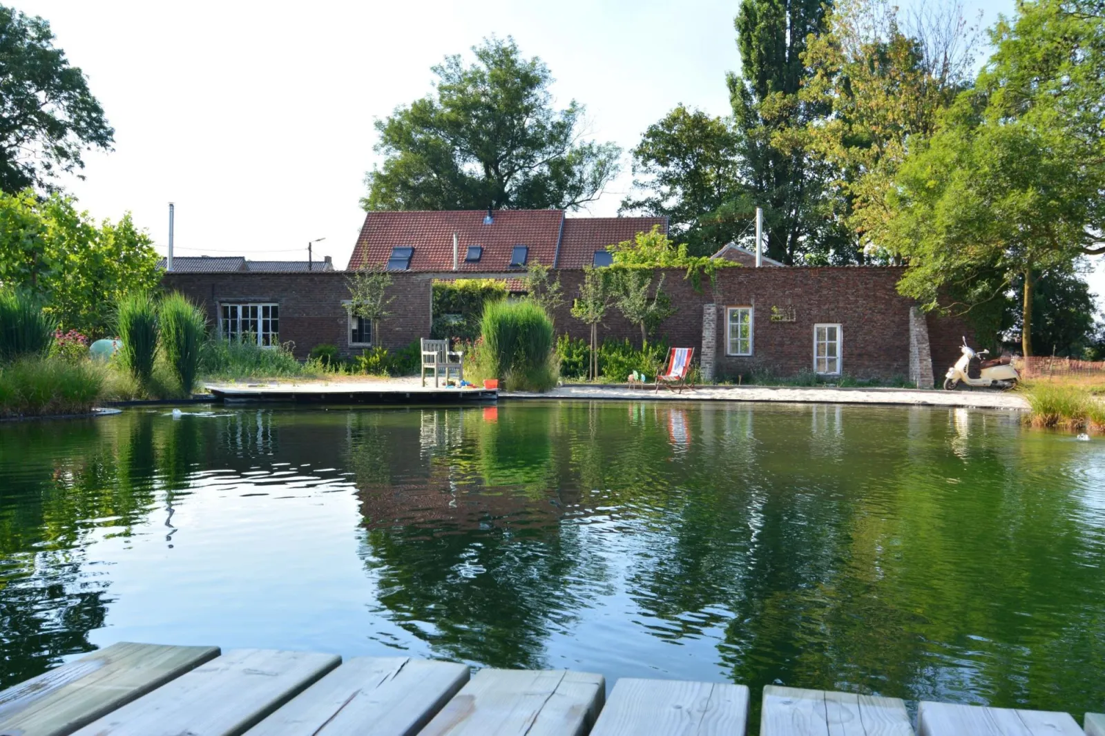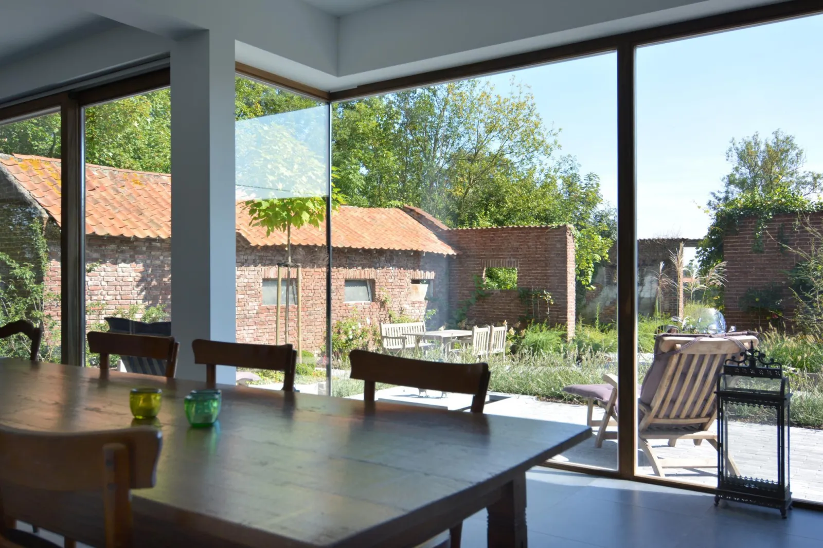 Overal in de woningen heb je zicht op de tuin met zwemvijver en de omliggende weiden en velden. In de leefruimte met compleet uitgeruste keuken, eet je met het hele gezelschap tot 16 personen aan de kloostertafel. Je hebt er echt een gevoel van thuiskomen. In beide woningen kom je via een schuifraam bij de zuidelijk gerichte binnentuin met verschillende terrasjes. BBQ en tuinmeubilair zijn aanwezig. Bij koude dagen is het opperbest bij het haardvuur!