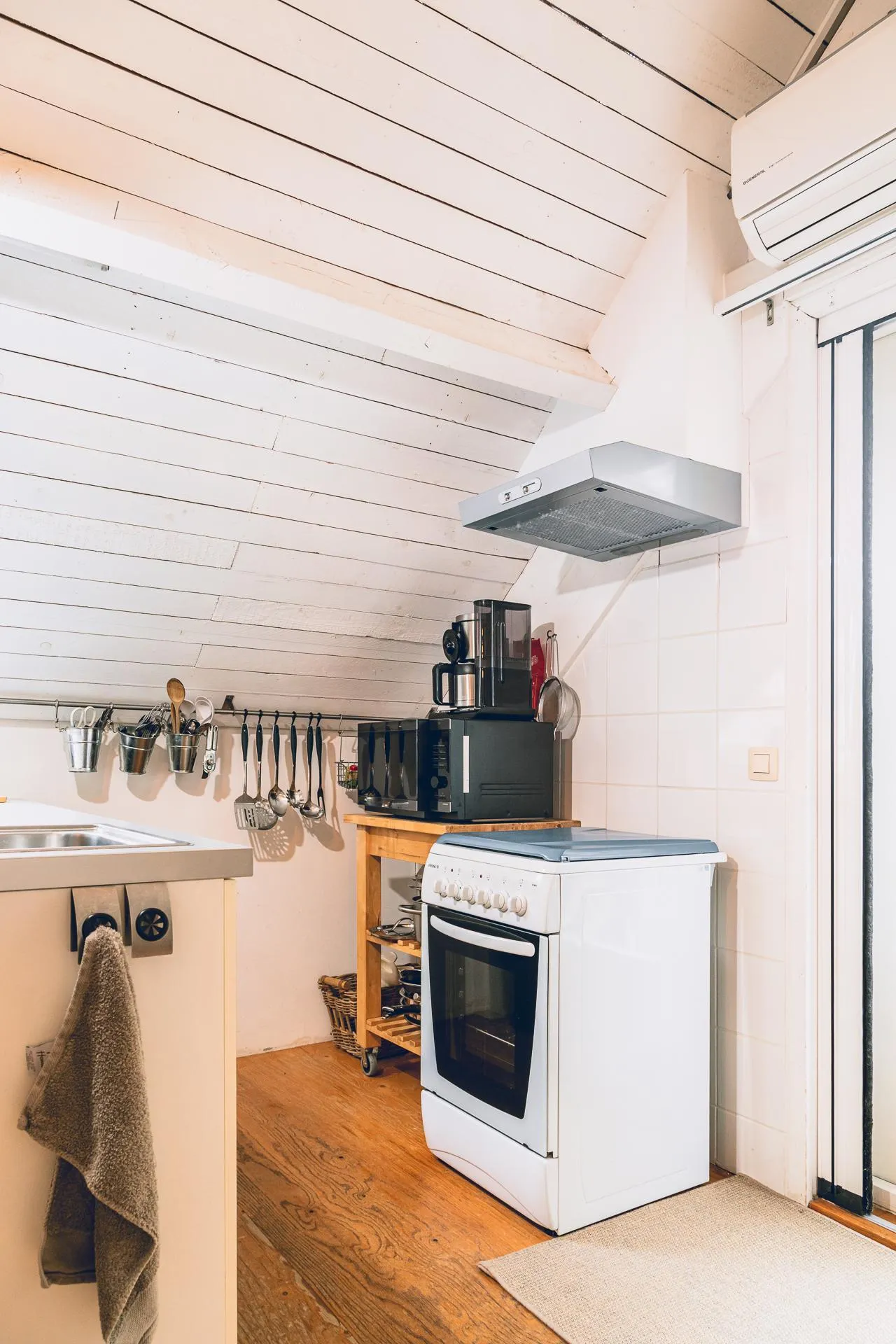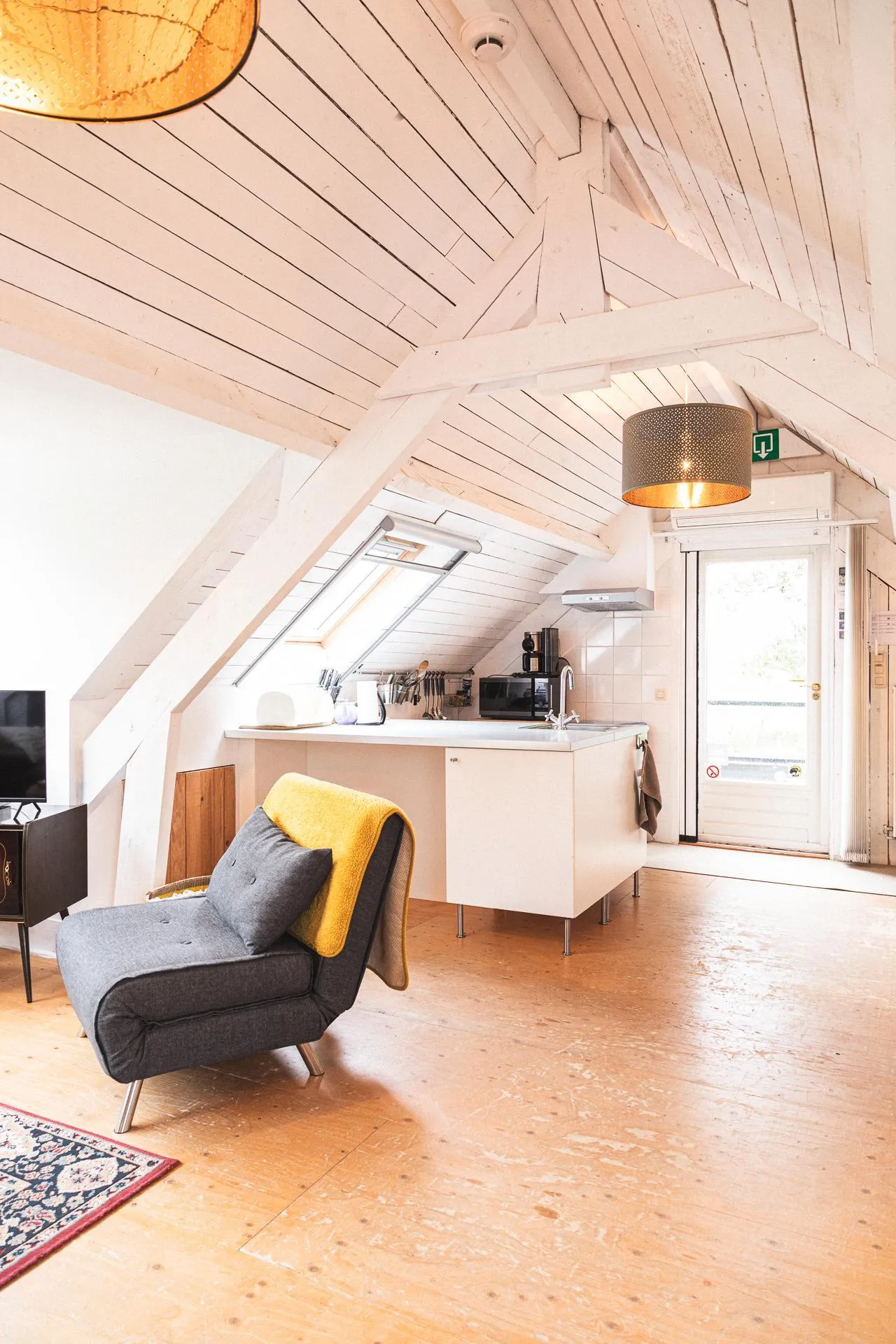 De vakantiewoning bevindt zich in het nieuwe deel van de woning, boven de schuur en is bereikbaar via een aparte buitentrap, wat zorgt voor de nodige privacy. Het omvat een grote ruimte, waar enkel de badkamer volledig afgesloten is. De slaapruimte (voor 2 pers) bevindt zich achter een scheidingswand. Daarnaast biedt de leefruimte nog 2 extra slaapplaatsen (2 slaapzetels). Vanuit de keuken/eetplaats en de recent gebouwde erker heb je een prachtig zicht over de velden. Een deel van de tuin behoort eveneens tot het gastenverblijf.