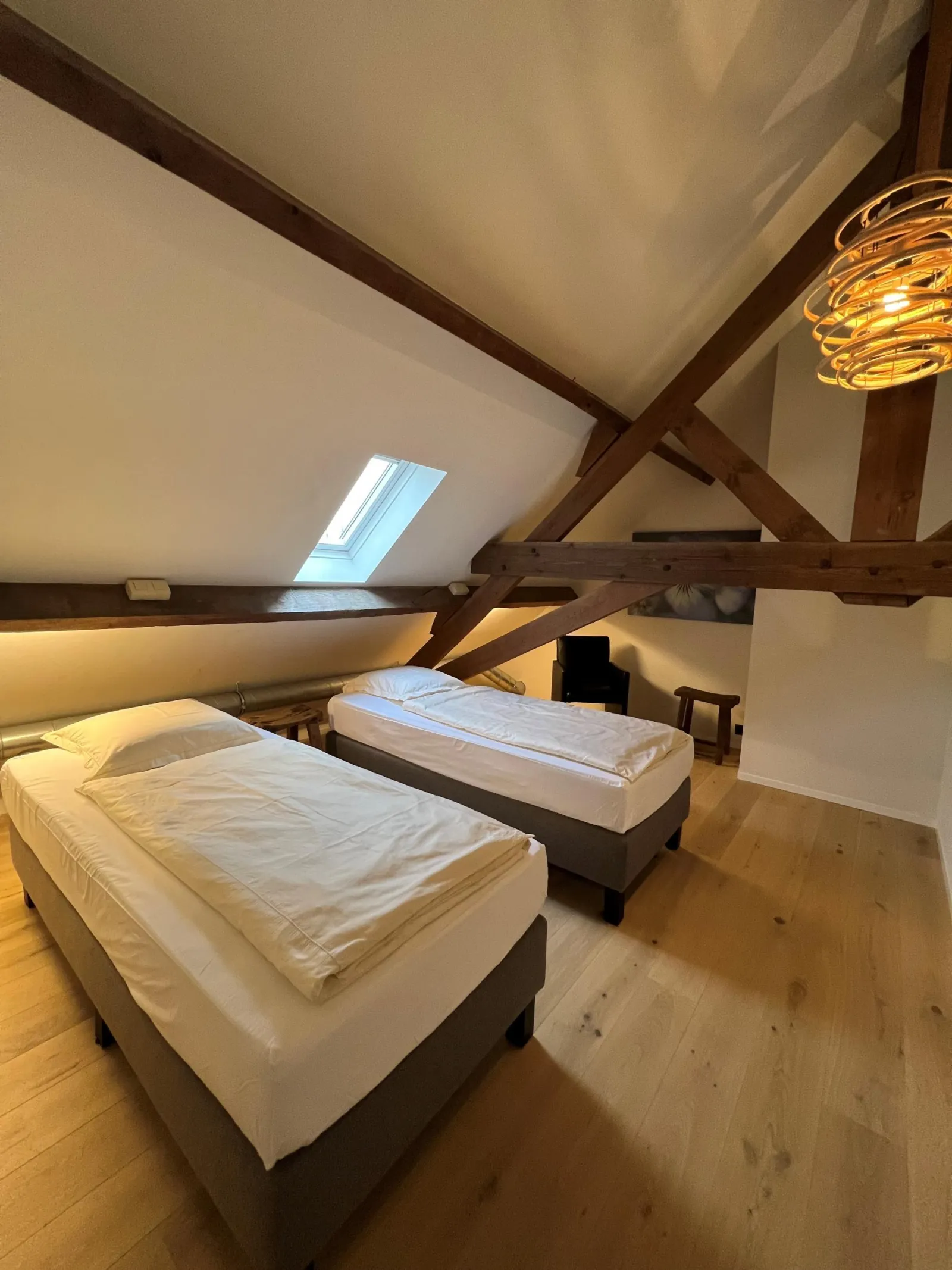 Het logies heeft 3 familiekamers met een mezaninne en 2 kamers voor 2 personen, 4 kamers op het gelijkvloers en verbonden met de open keuken en living, 1 kamer via de trap.