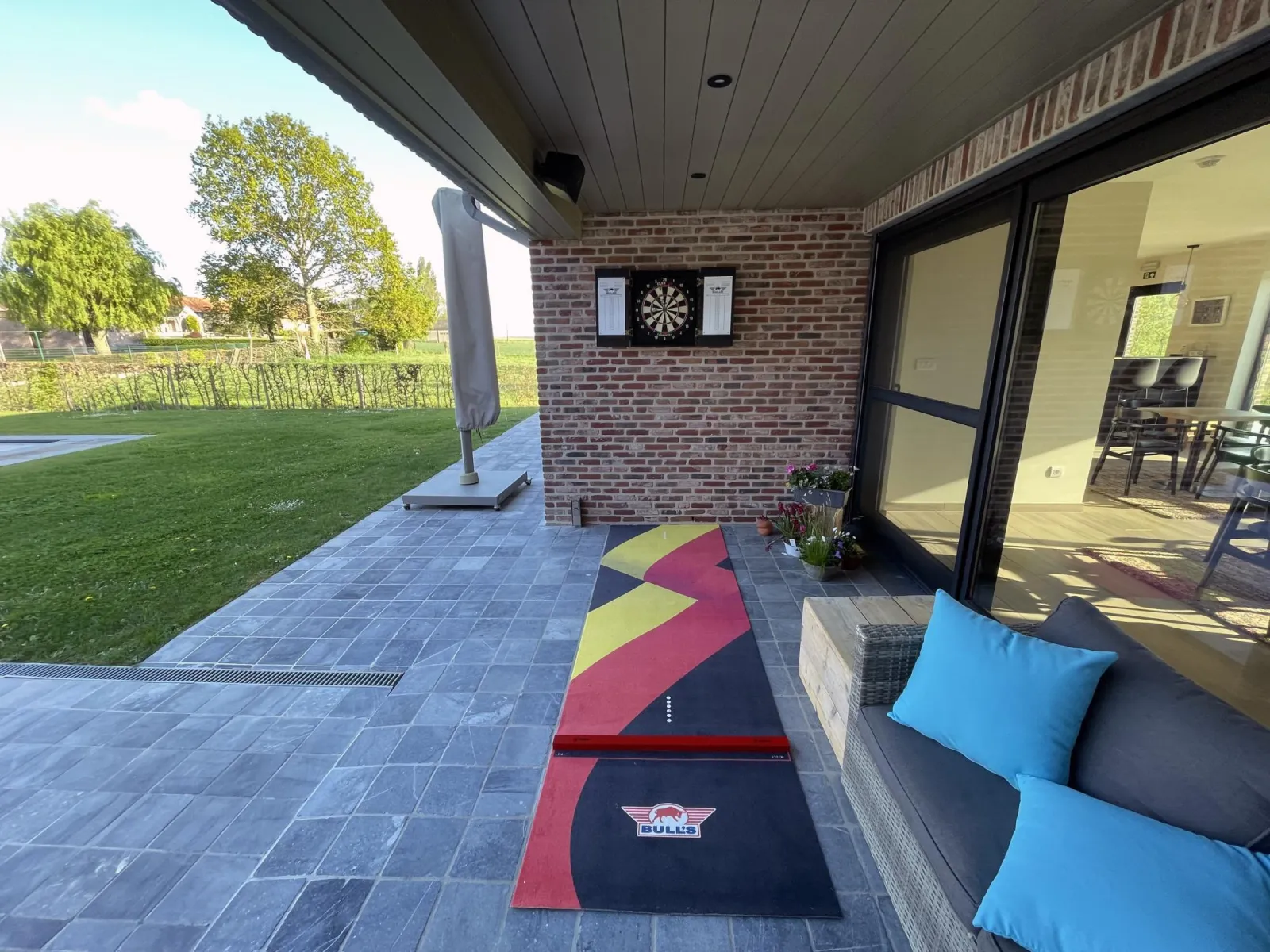- Diverse terrassen, allen voorzien van tuinmeubelen zodat je op elk moment van de dag van de zon kan genieten. Bij minder goed weer kan je terecht op het overdekt terras van het bijgebouw (kan verwarmd worden).
