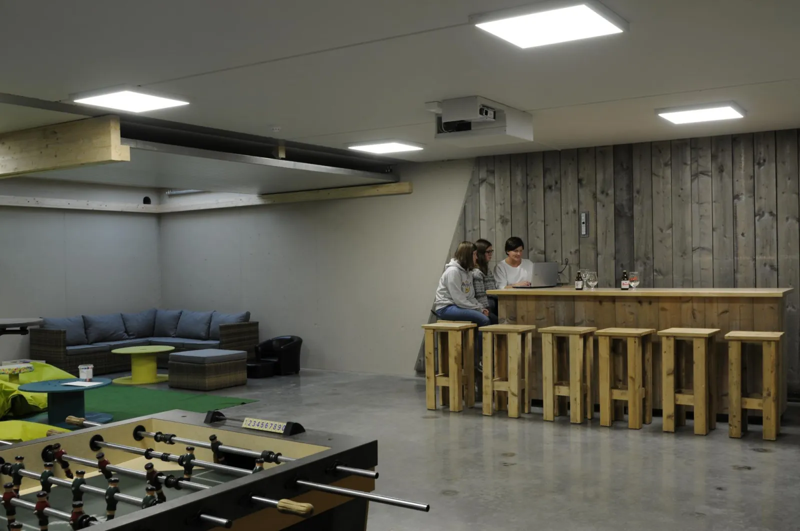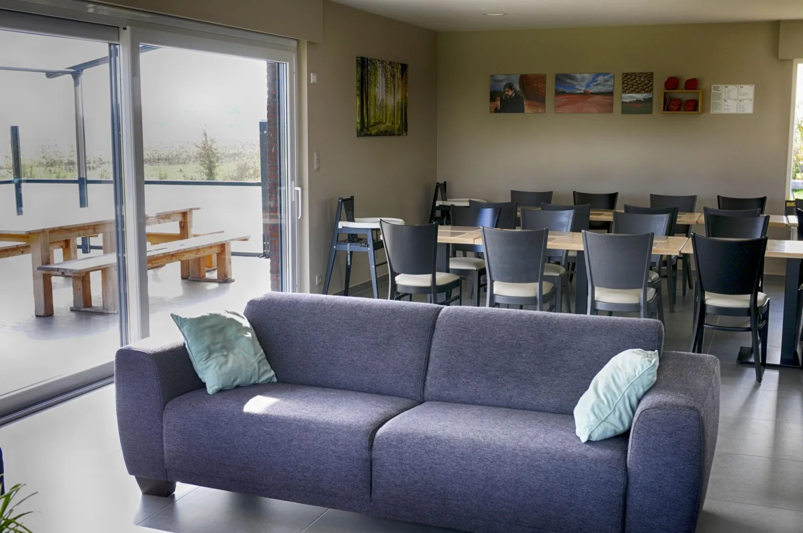 11 kamers en 9 badkamers bieden een comfortabel verblijf voor een groep tot 28 personen. Elk badkamer heeft een eigen toilet, douche en wastafel. Er zijn 2 grote gemeenschappelijke ruimtes: op het gelijkvloers en in de kelderruimte waar volop kan gekickerd, darts, tafelvoetbal gespeeld worden. 's...